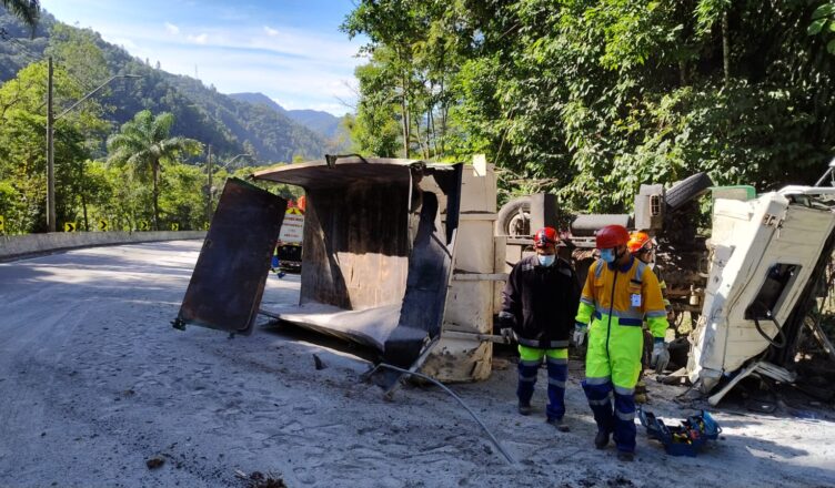 Segundo os bombeiros, o acidente ocorreu por volta das 13 horas, no Km 78,5 na pista de descida em direção até Caraguatatuba. Além da limpeza da areia que caiu na pista pela equipe da concessionaria Tamoios, os bombeiros fizeram a contenção de vazamento de combustível para evitar riscos de incêndio e danos ambientais.