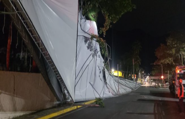 A forçado vento, que atingiu mais de 65 quilômetros por hora também derrubou uma tenda no bairro São Francisco, na região central. A cobertura era para Festa de São Pedro Pescador e já foi substituída.