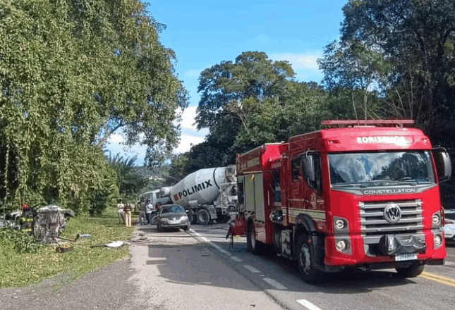 Segundo o Corpo de Bombeiros, o acidente- uma colisão entre um veículo e um caminhão, ocorreu às 9h40, nas proximidades do Km 85+ 900, na praia da Mococa, na região norte de Caraguatatuba.