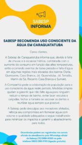 A Sabesp de Caraguatatuba informa que, devido à falta de chuvas e à escassez hídrica, combinada com o aumento do consumo em função das altas temperaturas, estão ocorrendo eventos de baixa pressão e falta d´água em algumas regiões mais elevadas dos bairros Olaria, Querosene, Casa Branca, Jardim Guaxinduba, Jardim Terralão, Martin de Sá, Recanto Casa Branca e Sumaré.