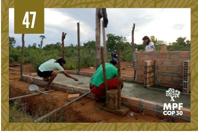 Foto de pessoas trabalhando na construção de uma estrutura em um ambiente rural. Há tijolos organizados no chão e postes de madeira verticais, sugerindo o início de uma edificação. O local é cercado por vegetação.