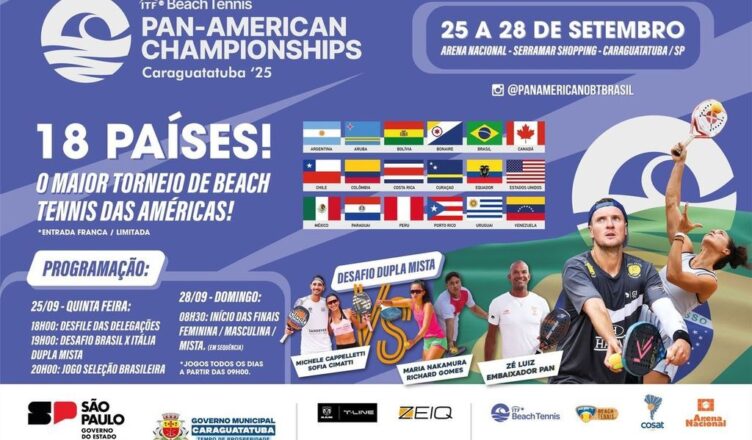O Serramar Shopping, em Caraguatatuba, sedia a partir desta quinta-feira, dia 25, o Pan-American Championships de Beach Tennis, maior competição da modalidade no continente. A cerimônia de abertura está marcada para acontecer nesta quinta-feira (25), às 18h, com desfile das delegações e, logo em seguida, às 20h, a primeira disputa do campeonato, Brasil e Itália na modalidade de Dupla Mista.