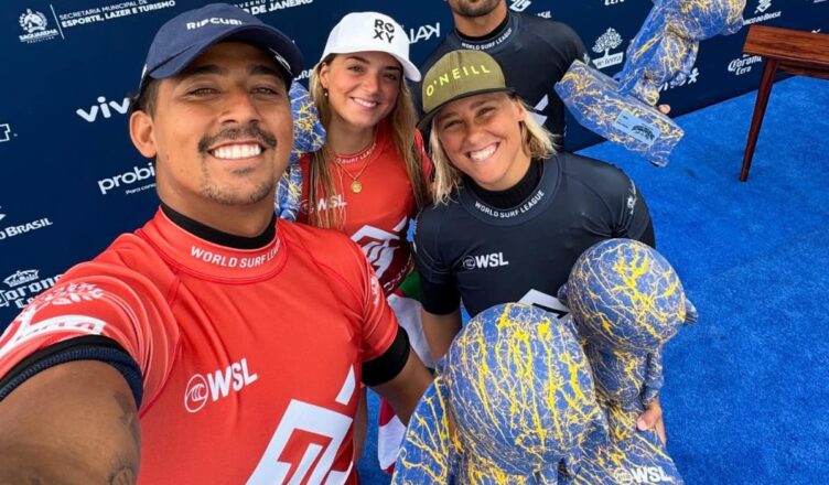 Foto Capa/WSL: Samuel Pupo recebendo o troféu da competição em Saquarema(RJ), com a campeã Yolanda Hopkins no fminino e os vice-campeões Eli Hannman e Annette Gonzales.