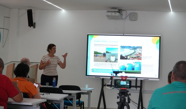 Companhia aumenta a produção e a reserva de água, moderniza estações e intensifica a manutenção para suportar o aumento populacional de 4,5 vezes na alta temporada. Foto Capa: Monica Riccitelli, gerente regional da Sabesp no Litoral Norte apresenta plano de verão para jornalistas da região