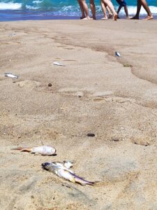Peixes mortos na praia do Centro em 2024