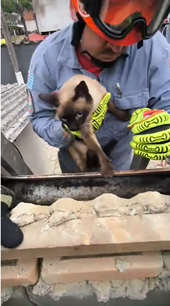 Um gato estava preso em um estreito “corredor” entre o forro e o telhado de uma residência. A tutora estava desesperada e acionou os bombeiros.