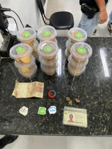 Durante a abordagem ao suspeito, foi encontrada em sua mochila grande quantidade de entorpecentes, incluindo substância derivada de maconha já preparada para a venda, além de sementes, porções de droga em diferentes formas e dinheiro em espécie.