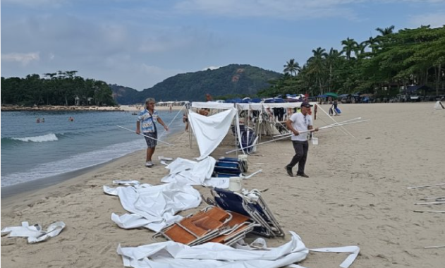 A fiscalização também se intensificou na Praia de Cambury, onde foi constatada a ocupação irregular da faixa de areia. No dia 29 de dezembro, foram apreendidas 18 barracas tipo gazebo, de propriedade do condomínio Master Camburizinho II, instaladas sem ocupantes, caracterizando reserva indevida de espaço público, em desacordo com o Artigo 33, inciso X, da Lei Municipal 848/92 (Código de Posturas). O condomínio recebeu multa de R$ 5 mil. No mesmo local, outras sete barracas azuis sem identificação de responsável também foram desmontadas e apreendidas.