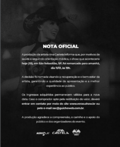 A Prefeitura de São Sebastião  distribuiu uma nota informando que, por orientação médica, a produção da cantora Ana Castela optou por remarcar o show. A decisão foi tomada com responsabilidade e cuidado, priorizando a saúde da artista e respeitando o público que aguardava esse momento especial. Sabemos da expectativa de todos e agradecemos a compreensão.