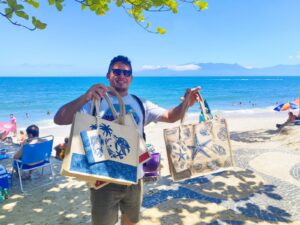 O ambulante, Rodrigo Bento, também, da Bahia, vende as bolsas feitas de juta, que são produzidas no Maranhão, As bolsas oferecidas por Rodrigo nas praias também vem tendo boa aceitação. Cada uma delas custa em média R$ 50,00. Juta é uma fibra têxtil vegetal, natural, biodegradável e resistente, extraída do caule da planta de juta (Corchorus), conhecida como “fibra de ouro” por sua versatilidade em sacos, cordas, moda e decoração, sendo um cultivo sustentável na Amazônia brasileira que gera renda para comunidades ribeirinhas.