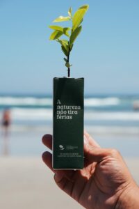 No fim de tarde, quando o sol começa a baixar e a praia se enche de famílias, crianças e comerciantes, um personagem verde em forma de semente surge caminhando pela areia. Ao lado dele, um carrinho itinerante chama a atenção de quem passa. Dentro, em vez de picolés, mudas de espécies nativas da Mata Atlântica. A cena marca a campanha “A Natureza Não Tira Férias”, iniciativa do Instituto Conservação Costeira (ICC) para sensibilizar moradores e turistas sobre a preservação de um dos maiores remanescentes contínuos de Mata Atlântica do Brasil, no litoral norte paulista.