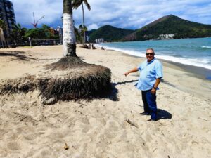 “De 2022 para cá a erosão foi mais intensa. em frente ao meu quiosque( o último no lado direito da praia) já perdemos cerca de 50 metros de faixa de areia. A areia que saí daqui está sendo depositada no outro canto da praia. Suspeito que esse processo erosivo se intensificou a partir da construção dos molhes. Isso tem que ser analisado”, comentou Ari Barbosa, dono do Quiosque Canto Bravo, um dos mais visitados da Martim de Sá.