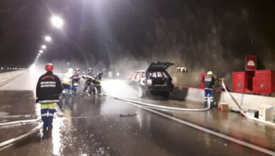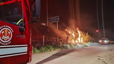 Bombeiros socorristas da Tamoios agiram rapidamente para controlar o fogo. Fotos: Corpo de Bombeiros Um veículo pegou fogo quando trafegava por um