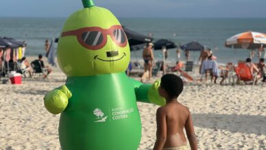Ação do Instituto Conservação Costeira ocupa praias e comércio local com mascote inflável, carrinho itinerante e distribuição de mudas nativas No